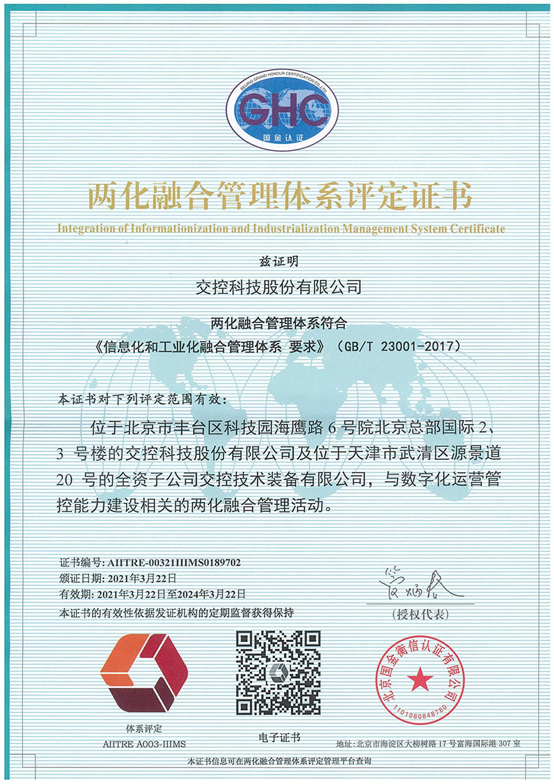公司通过了GB/T 23001-2017信息化和工业化融合管理体系认证